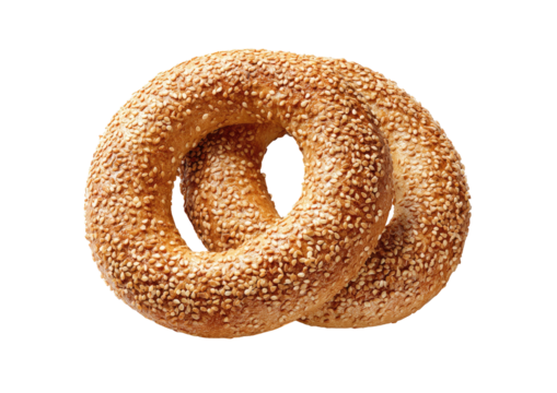 Sesame-covered double ring bread against solid black background