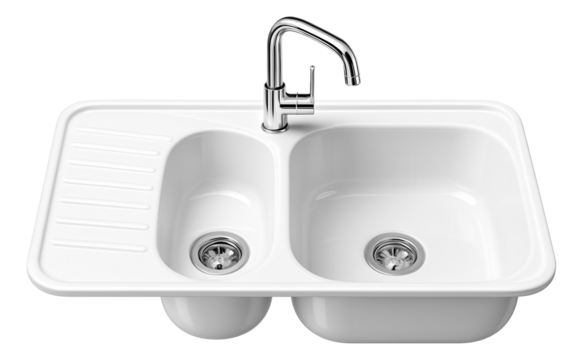 Modern stainless steel double bowl kitchen sink with two integrated drains, glossy reflective finish and clean lines, isolated on transparent background for installation use