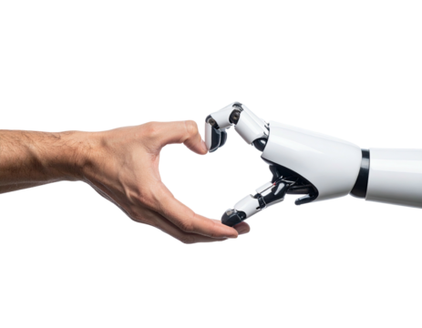 A human hand forms a heart shape with a robotic hand, suggesting collaboration