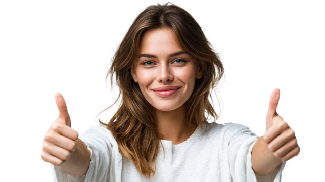 Smiling young woman showing double thumbs up gesture isolated on transparent background