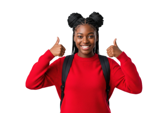 young african american female student (teenager) with braided space buns, red sweater, and backpack giving an energetic double thumbs-up on a high-key white background. concept of student success and