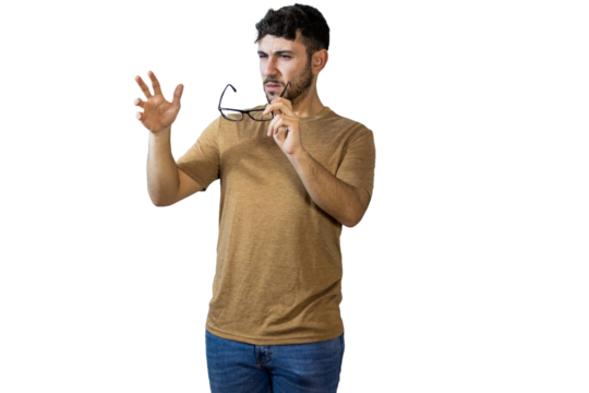 Young doubtful man thinking, scratching head and trying to find solution on isolated transparent background