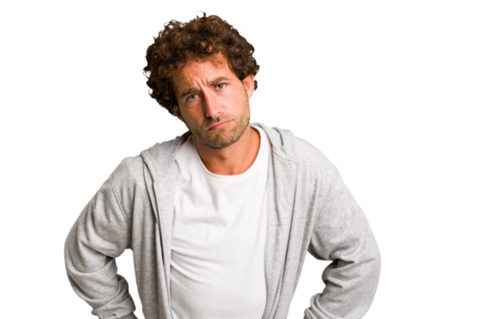 Young curly smart caucasian man cut out isolated confused, feels doubtful and unsure.