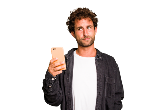 Young caucasian man using mobile phone isolated confused, feels doubtful and unsure.