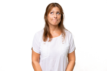 Middle-aged caucasian woman over isolated background having doubts while looking up