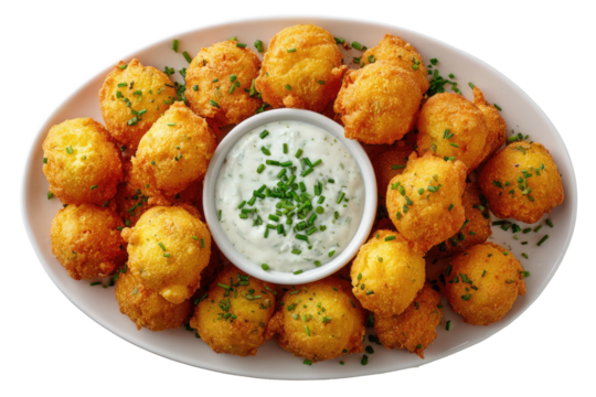 A top view of a white plate filled with golden brown fried dough balls isolated on white background