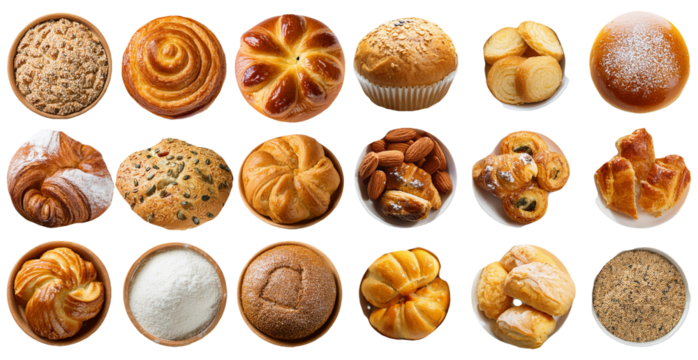 Set of Six Assorted Gourmet Pastries and Croissants Isolated on Black Background