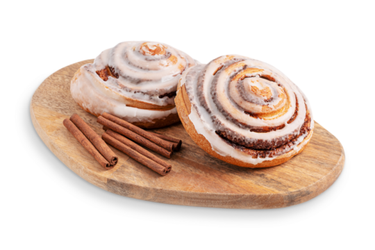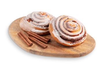 Crusty sweet freshly baked homemade cinnamon bun rolls glazed with sugar icing served with spice sticks on wooden cutting board isolated on white background as pastry dessert snack for breakfast