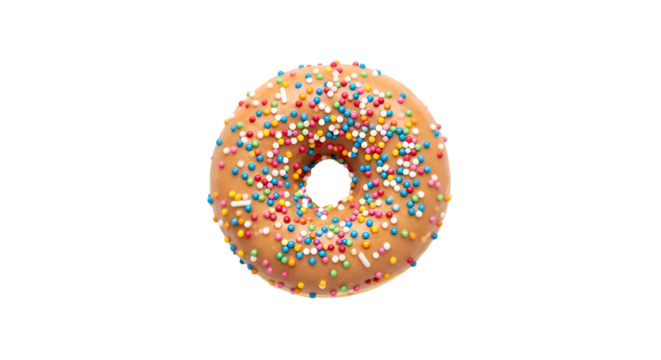 baked donut with pink frosting and colorful sprinkles isolated on transparent background
