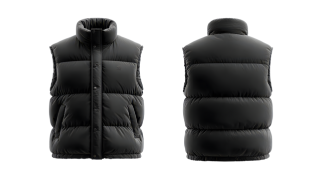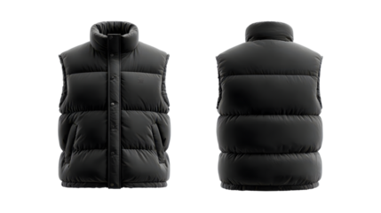 Black puffer vest mockup showing both front and back views, sleeveless jacket, isolated on transparent backgrounded