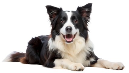 Happy border collie dog lying down with its mouth open and tongue out, isolated on transparent background