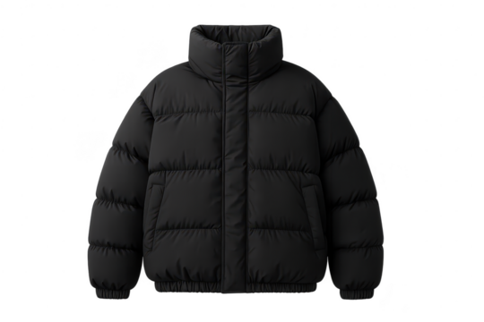 Classic black puffer jacket isolated on transparent background, cozy winter wear