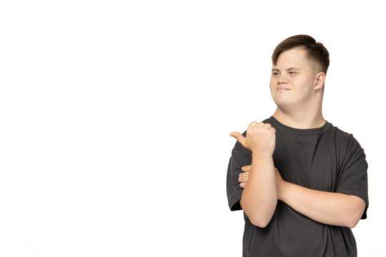 PNG,smiling young man with down syndrome in black t-shirt,isolated on white background