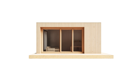 Exterior view of a prefabricated wooden tiny house with large windows revealing a cozy interior featuring a sofa and shelves