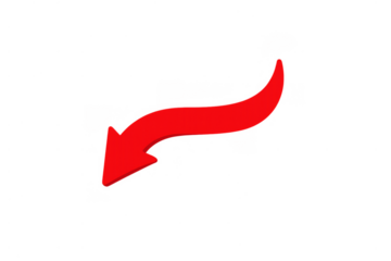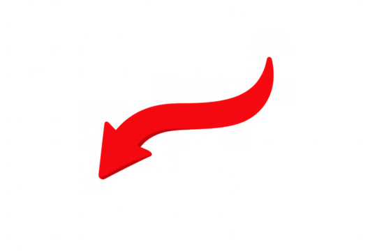 A glossy red three dimensional arrow curved downwards indicating a negative trend or direction isolated on transparent background