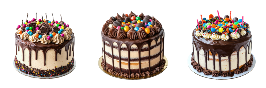 Set of delicious cakes with chocolate and multi-colored dragees isolated on transparent background PNG