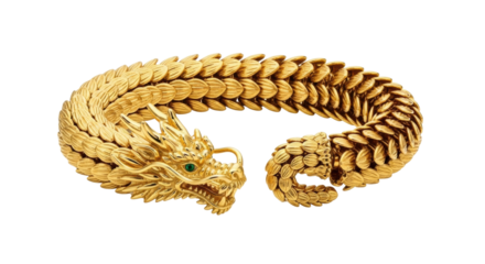 Intricately crafted yellow gold bracelet designed as a mythical dragon with textured scales and a vibrant green gemstone eye, representing power and wealth
