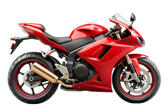 Shiny red sport motorcycle with gold exhaust and black seat isolated on a transparent background red motorcycle