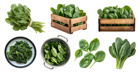 Spinach leaf leafy vegetable flowering plant, many angles view pile stack, wooden crate box, bundle, silver drainer tray, cooked on plate isolated on transparent cutout PNG. Mockup template design