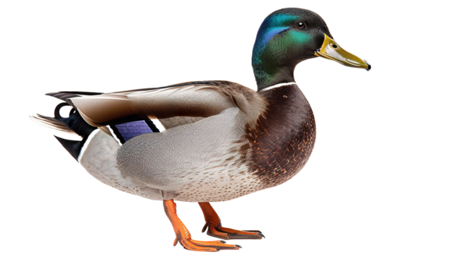 Male mallard duck standing in full body profile, displaying iridescent green head, orange webbed feet against transparent backdrop