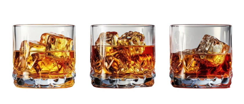 Set of 3 Different Aged Whiskey Varieties Isolated on Transparent or White Background, PNG