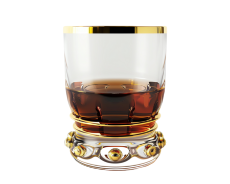 Elegant glass of whisky with intricate golden base and dark liquid, perfect for luxury and refined drink themes.
