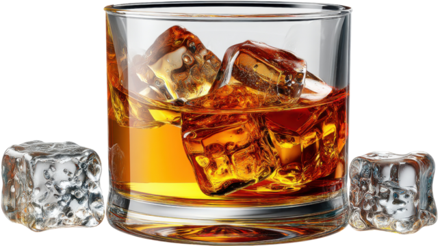 Glass of whiskey with ice cubes and amber liquid in crystal clear glass on wooden table, premium drink high quality photography png file isolated on transparent background