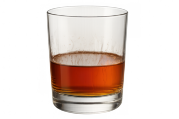 Whiskey glass containing amber spirit, alcoholic bourbon beverage for relaxation, transparent background