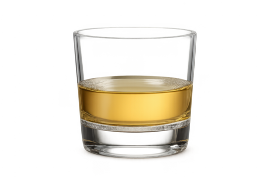 A glass of cold scotch whiskey on the rocks is an isolated luxury brown alcoholic beverage