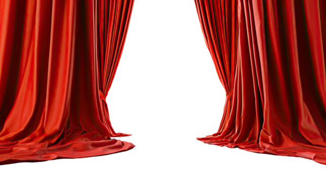 Red curtain hanging across classic theater stage creating dramatic atmosphere and rich theatrical ambiance on white background