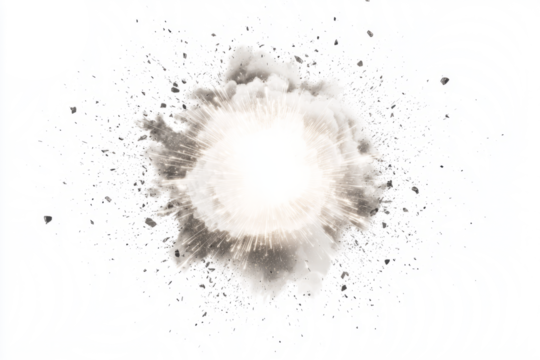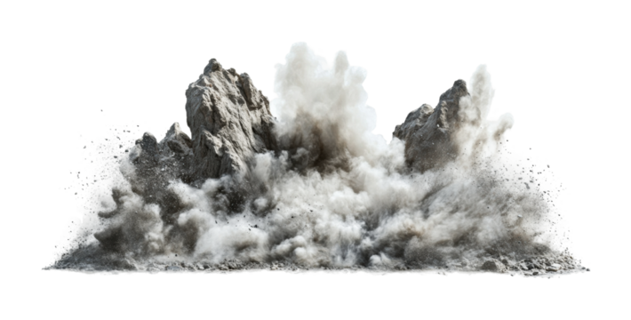 Powerful explosion with dust and debris rising above rocky terrain creating an impactful visual effect, cut out