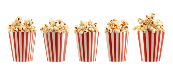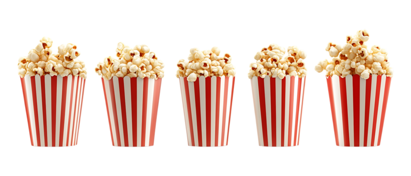 Set of Popcorn in Five Different Poses Against Transparent Background for Snack Branding, Movie Night Promotions, or Culinary Projects