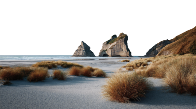 Seascape Vista: Witness the serene coastal vista, where rugged rock formations rise majestically from the tranquil beach. Serene seascape is depicted with precision