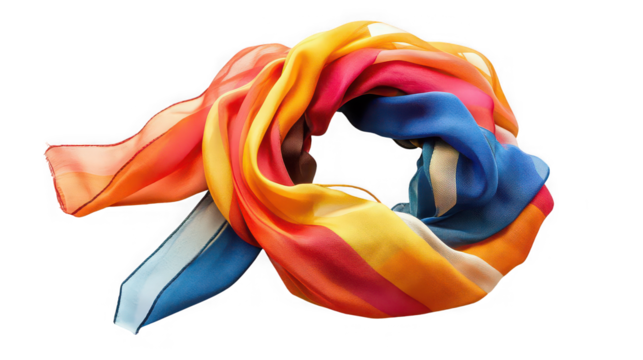 A colorful striped scarf draped and folded against a black background in a studio setting