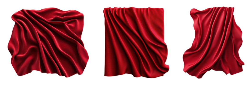 Flowing red satin fabric gently drapes isolated on transparent background, creating a visually striking effect.