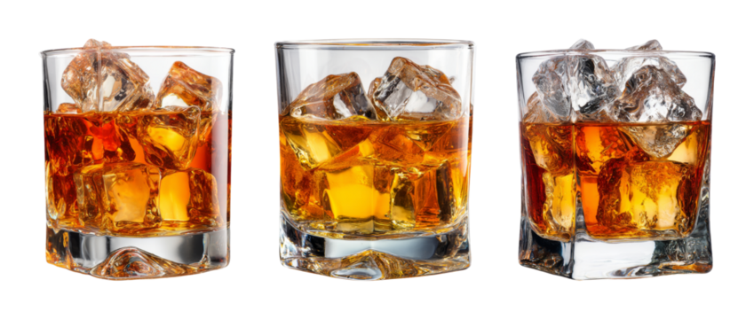 Refreshing amber whiskey neat with ice in clear glass, studio shot on black, perfect for luxury drink advertising PNG set with transparent background