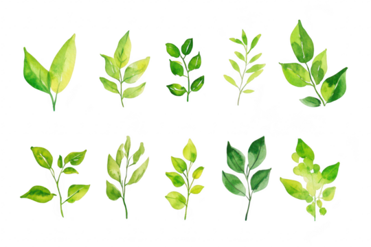 Assortment of lush, bright green tropical leaves, arranged against a white background