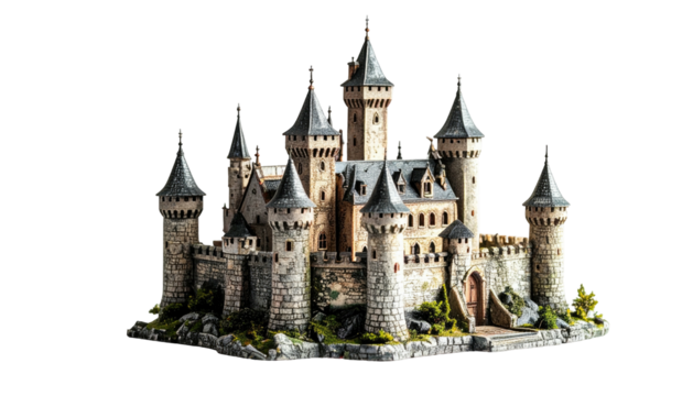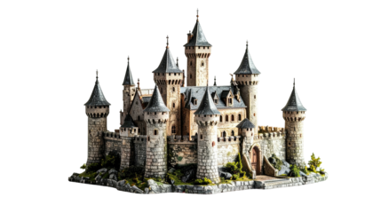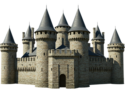 Majestic stone medieval castle with multiple towers and conical roofs isolated on transparent background