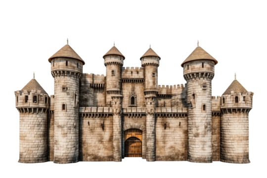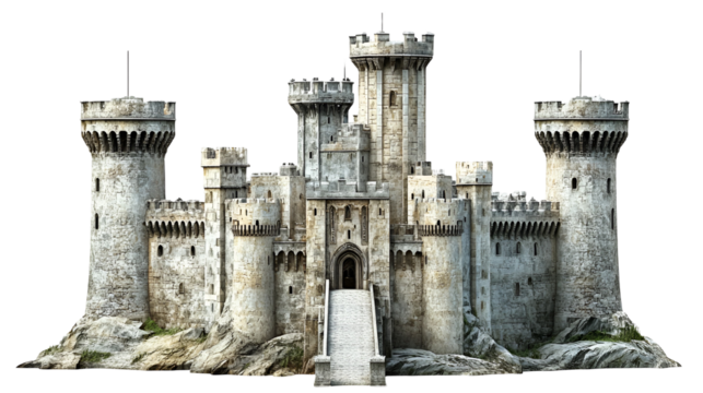 Majestic stone castle isolated on transparent background, medieval architecture with towers and drawbridge for historical and fantasy themes