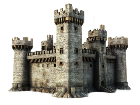 Medieval stone castle with Gothic windows, multiple towers, and crenellated walls, isolated on a transparent background