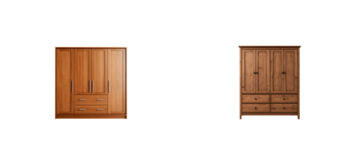 Two wooden wardrobes with multiple drawers and doors