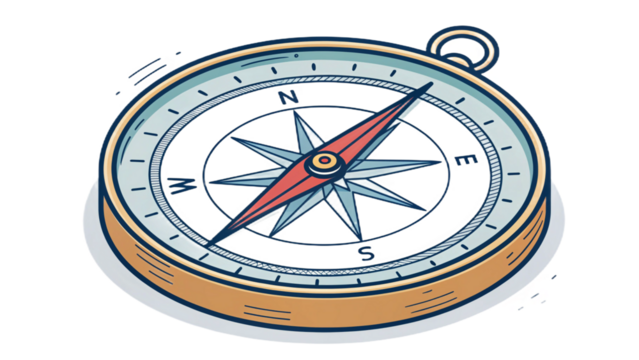 A classic brass and silver compass with a red needle pointing, representing navigation and direction, isolated on a transparent background