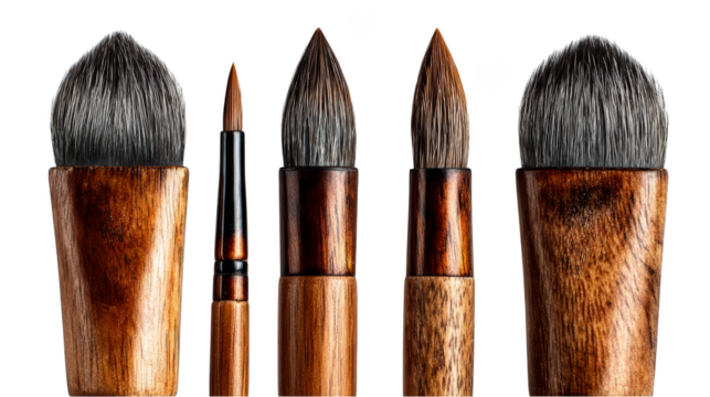 A diverse collection of painting implements arranged neatly showcasing a variety of bristle types sizes and handle materials for artistic creation and detailed craft work.