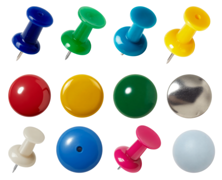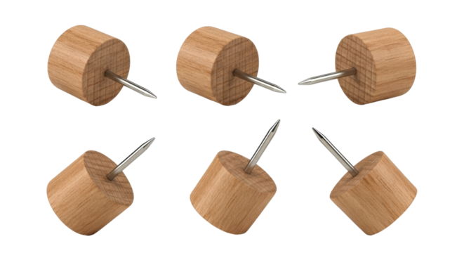 Isolated wooden drawing pin collection. Round and square pushpin set, push pins without background.