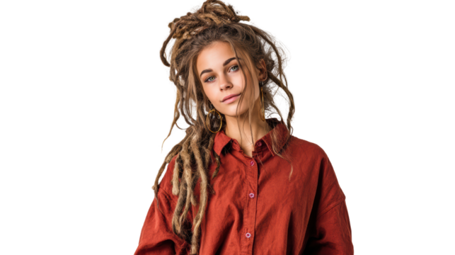 A young woman with dreadlocks wearing a red shirt, posing confidently against a white background.
