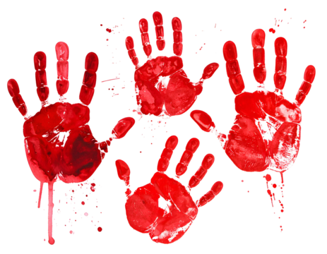 Four red handprints in watercolor style with dripping effects against black
