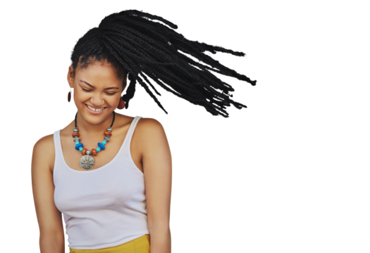 Shake hair, fashion and woman with a smile, excited and model isolated against a transparent background. Female person, movement and girl with happiness, dreads and beauty with aesthetic and png