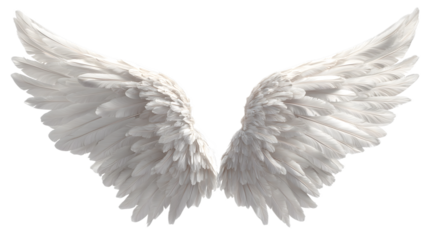 Large, white angel wings, symmetrical and spread, on a transparent background, showcasing detailed feathers