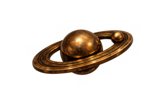 Bronze saturn planet model with orbital rings and moon, representing astronomy, space, and the solar system on transparent background