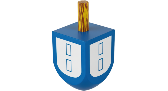 A dreidel with hebrew letters on its sides, appearing ready to spin or for display, set against a plain background